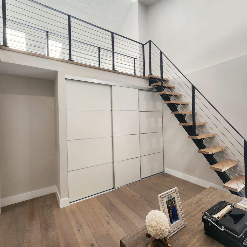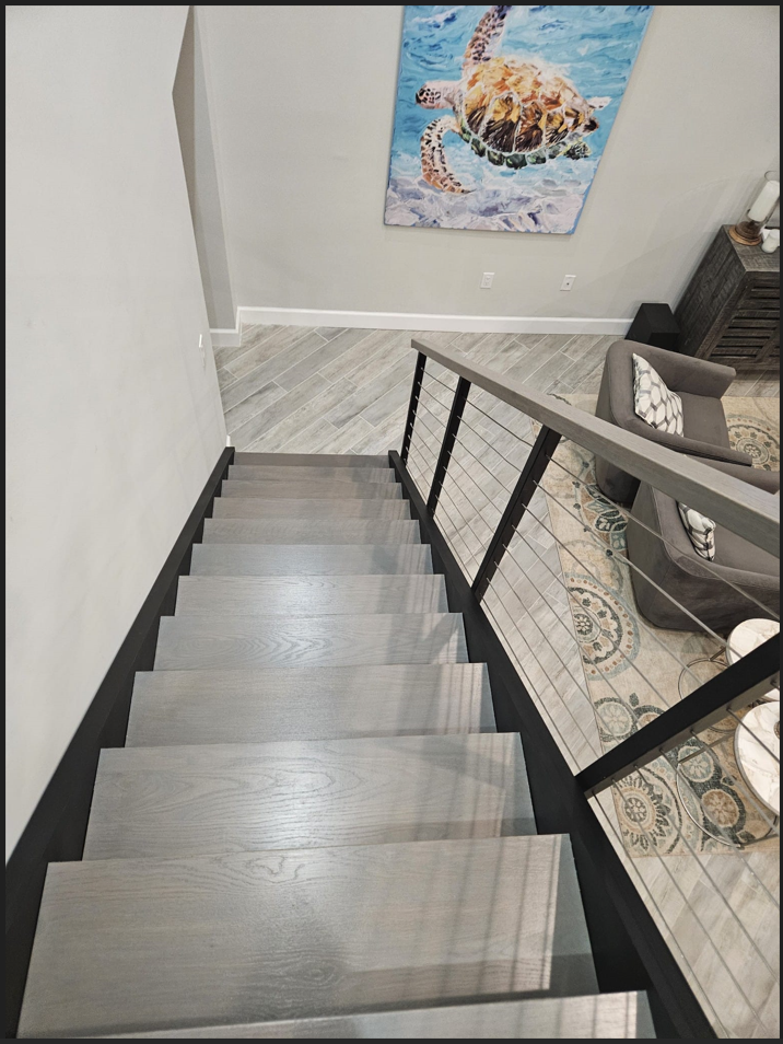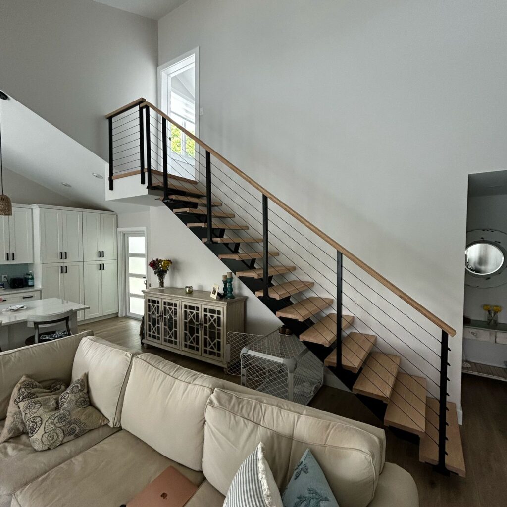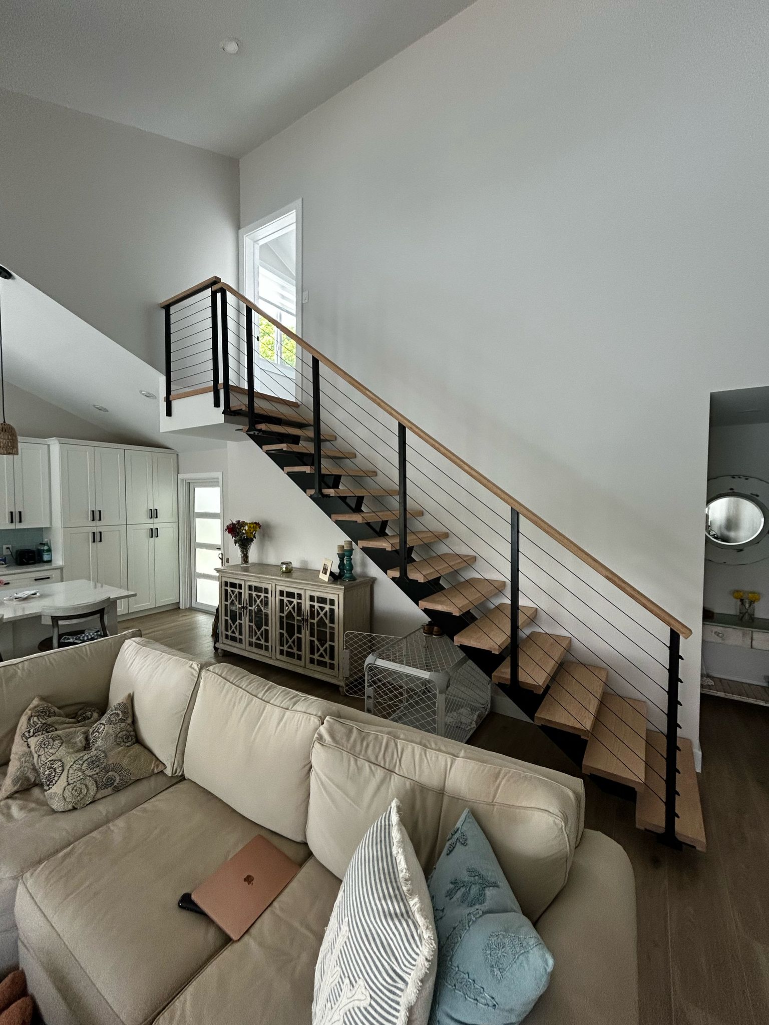 Aluminum single stringer floating stairs (11 steps), stair treads supported by 4" x 22.5" x .50" plate, 1.5" square tube posts tread mounted for stainless steel cables, handrail to be made of wood to match stair treads,