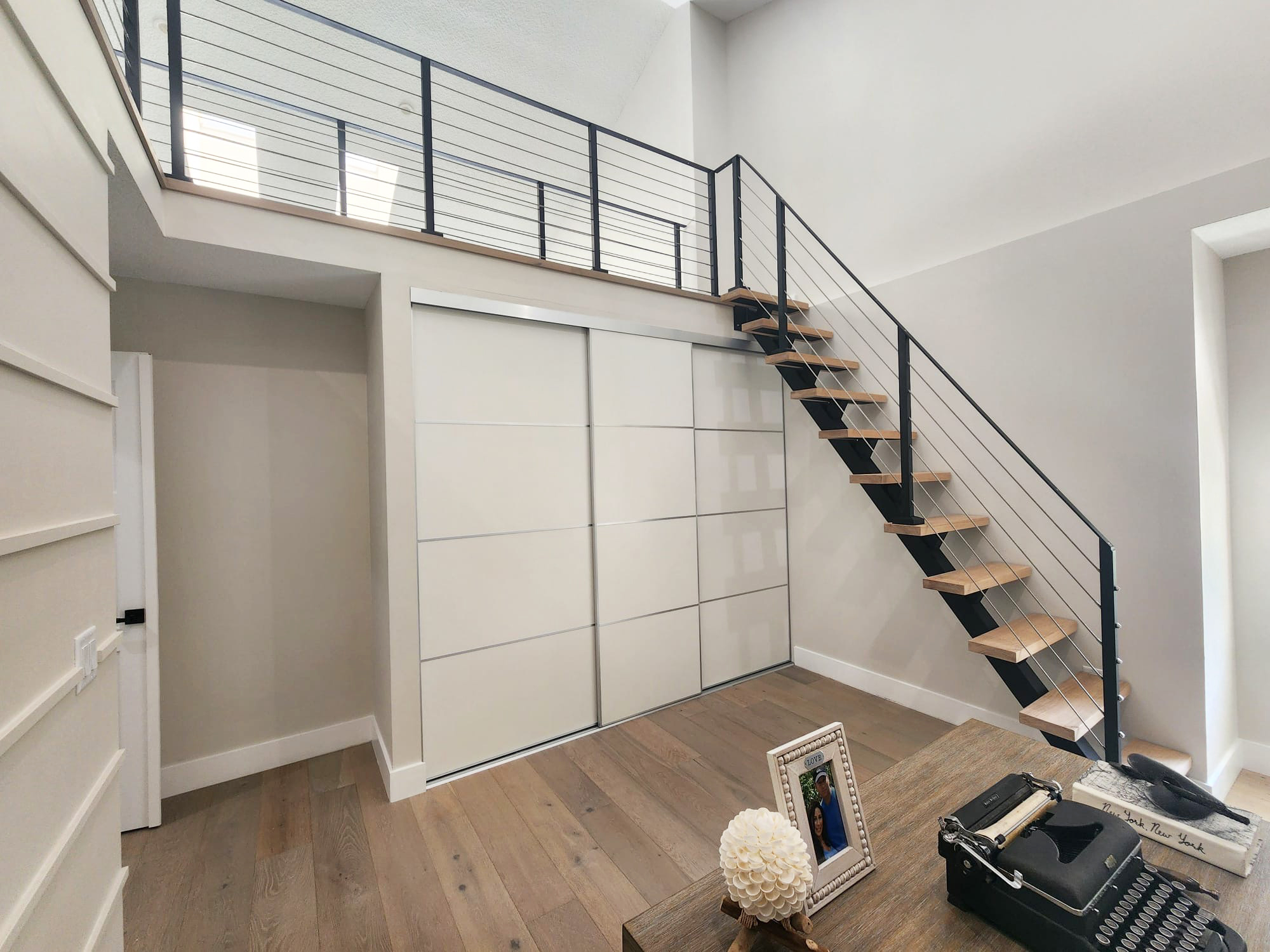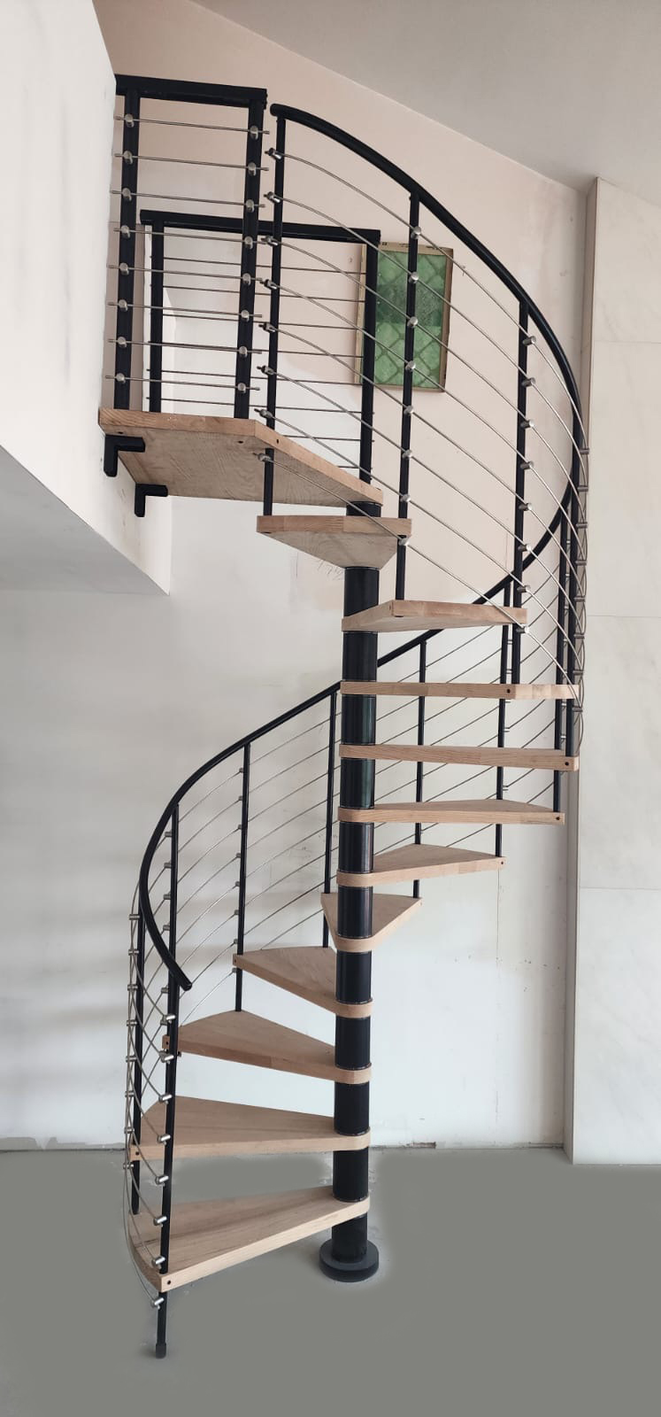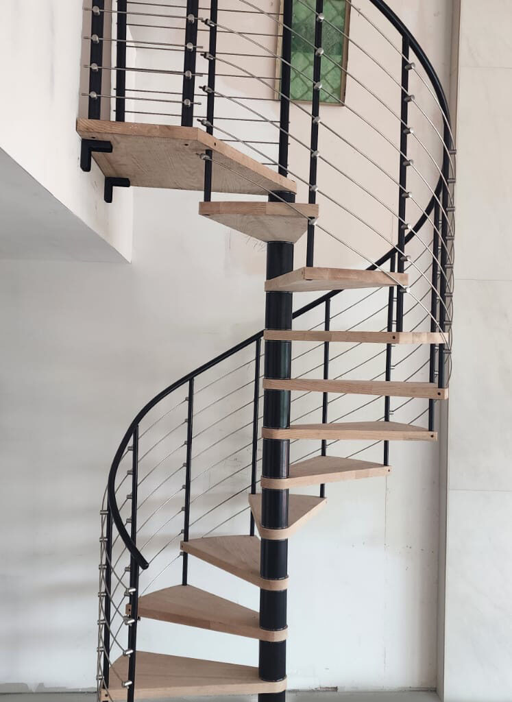 Interior spiral stair, stainless steel horizontal rods. Black powder coat finish on frame, posts and handrail. Treads will be red oak