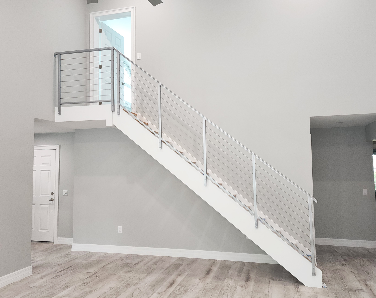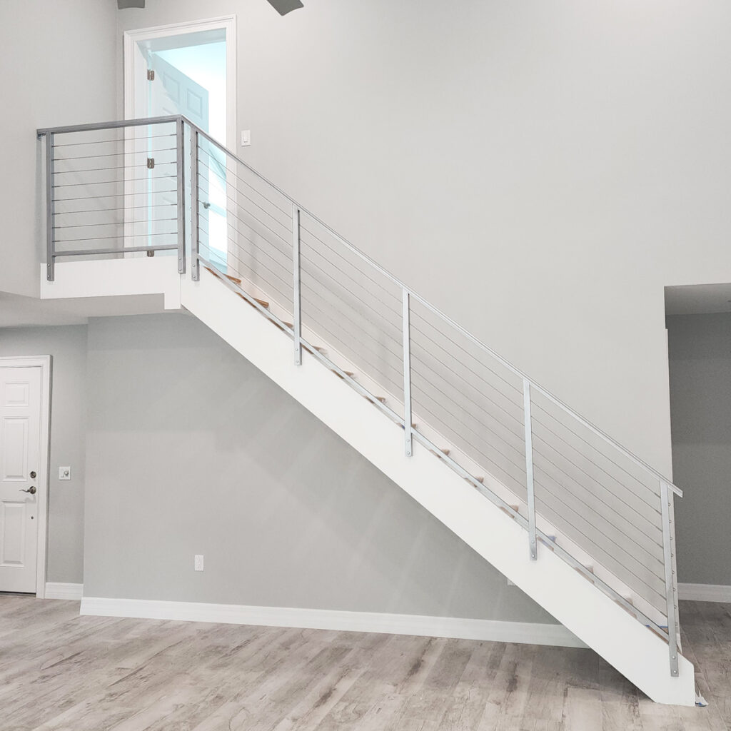 Stainless steel cables, aluminum powder coated posts and railing. Ideal for indoor or outdoor installation.